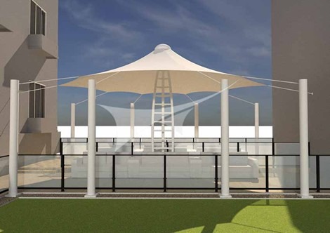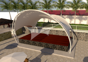 Model kanopi membran dengan bentuk melengkung yang memberikan tampilan lembut dan modern, cocok untuk berbagai area seperti taman atau halaman rumah.